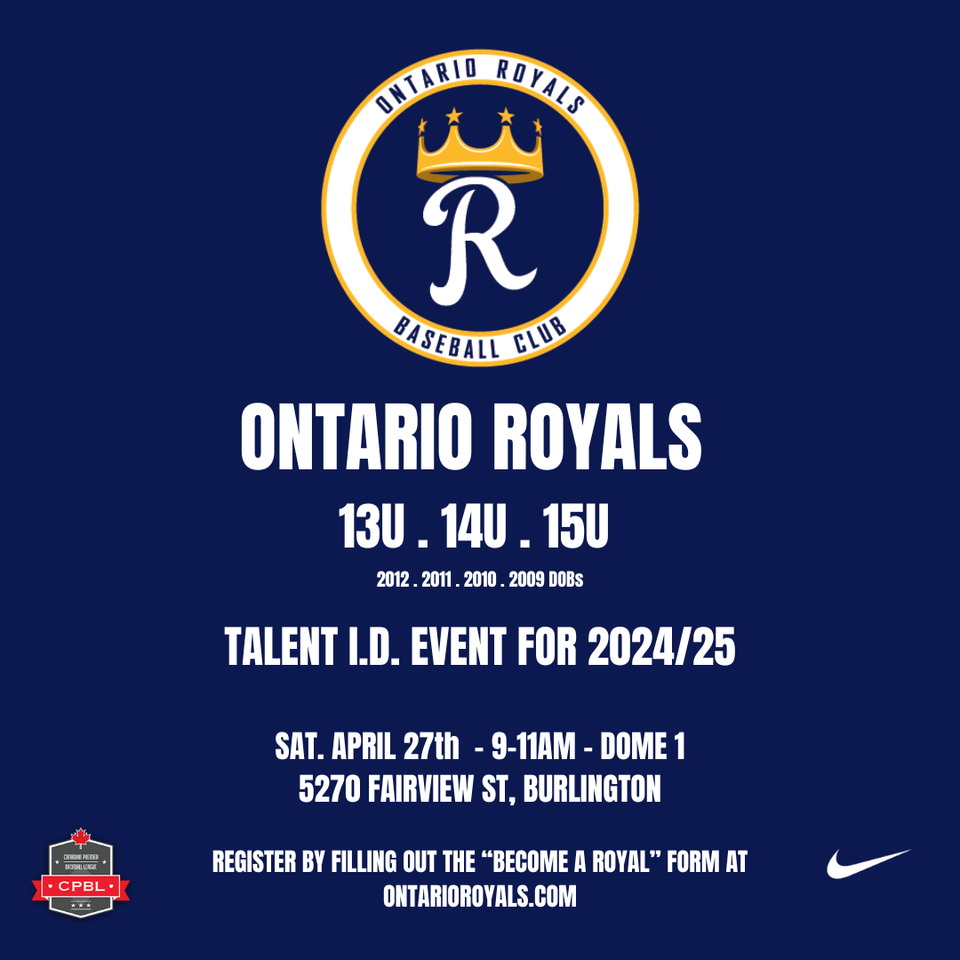 The Ontario Royals Baseball Club will be hosting our first tryouts for the 2024-25 season on SATURDAY, APRIL 27th, 9-11AM at 5270 Fairview St., Burlington (DOME 1)